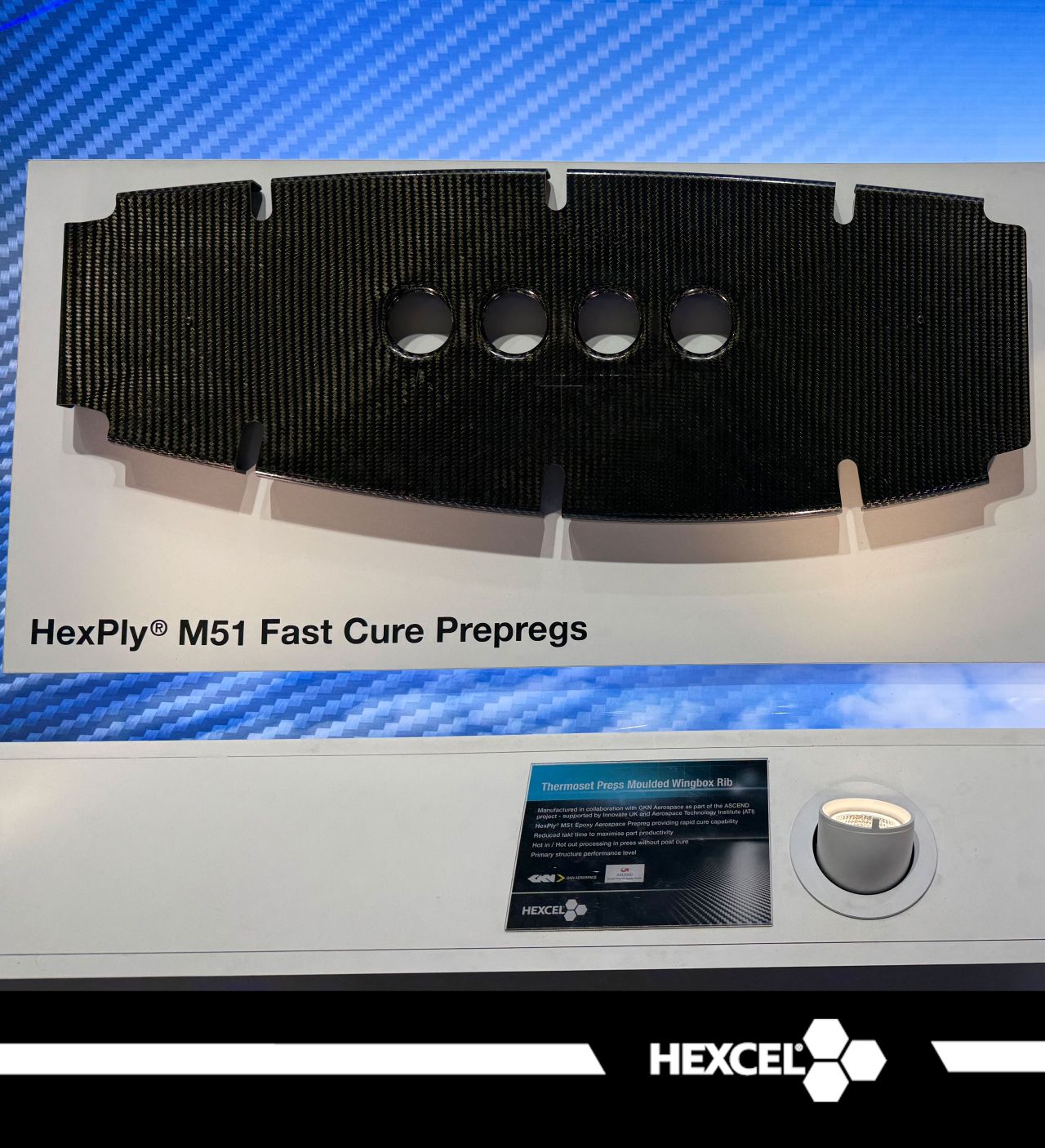 Al salone di Parigi la tecnologia era esposta in due esempi: un supporto per scatola alare a matrice termoindurente di GKN Aerospace, che mostra l’applicabilità su larga scala, e il telaio per fusoliera di Duqueine, realizzato nella metà del tempo usando i nastri unidirezionali in fibra di carbonio.