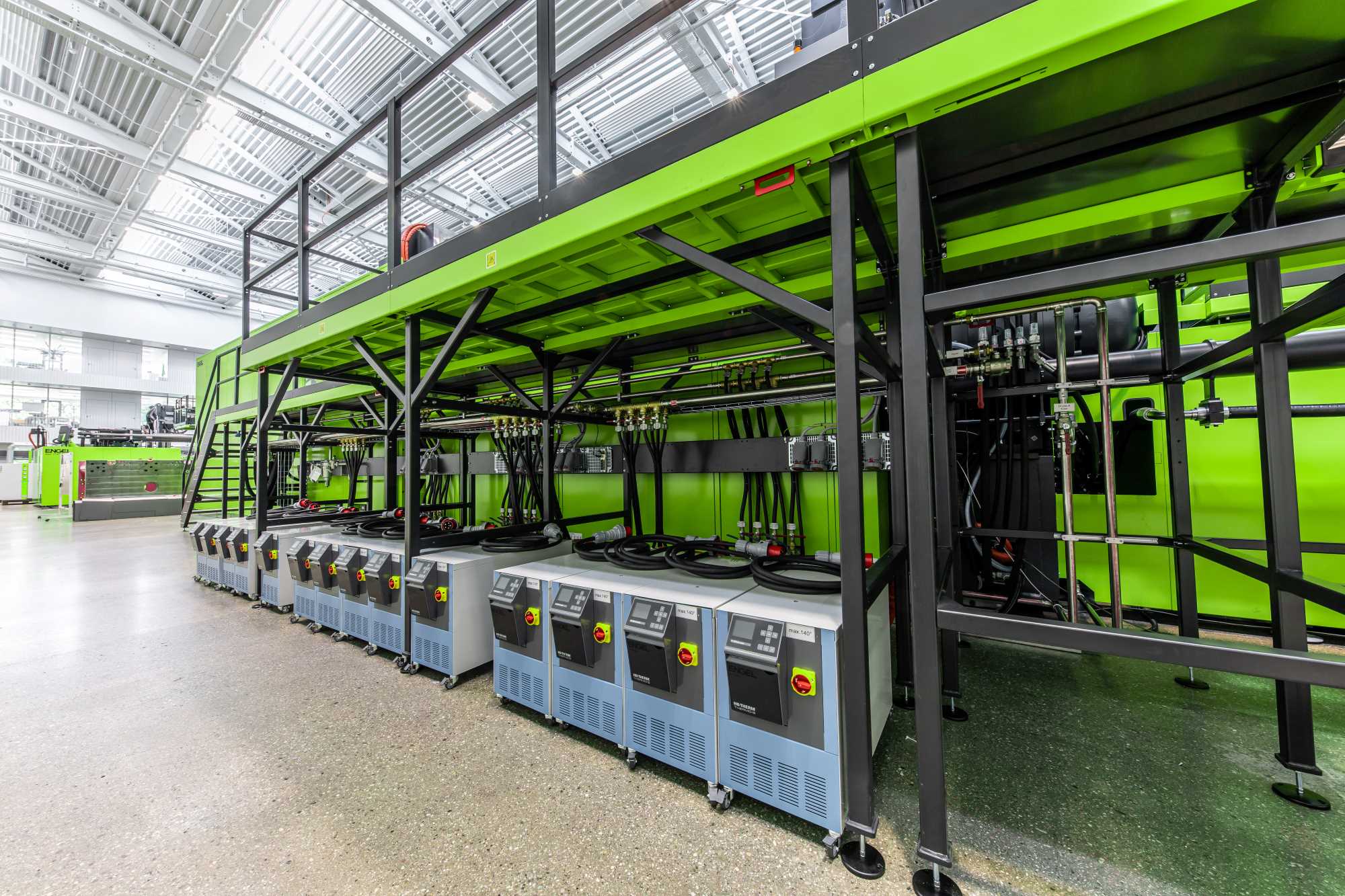 Le 14 unità di controllo della temperatura sono state installate sotto alla piattaforma sopraelevata della macchina (vedi foto in questa pagina web, ndr) per risparmiare spazio. Sono inoltre dotate di tubi flessibili d’alta qualità in PTFE (performance termiche) con guaina esterna in acciaio (performance meccaniche), che garantiscono una minima perdita di calore a 180°C e 20 bar di pressione. Grazie all’installazione vicino allo stampo, sotto alla piattaforma, la lunghezza dei tubi, e quindi le perdite di pressione e di calore, sono ridotte al minimo.