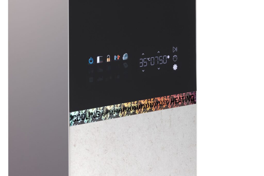 La pompa di calore per applicazioni residenziali combina superfici capacitive a sfioro con dettagli di design o scritte olografiche. Dati utili, simboli di funzionamento e altro sono incisi a laser e retroilluminati, integrati in un’unica soluzione touch laminata su una guida luminosa. La tecnologia PolyTC® VarioSym di Poly IC (controllata di Kurz) accorpa sensore, diffusore e lo strato superiore opaco in un unico strato.