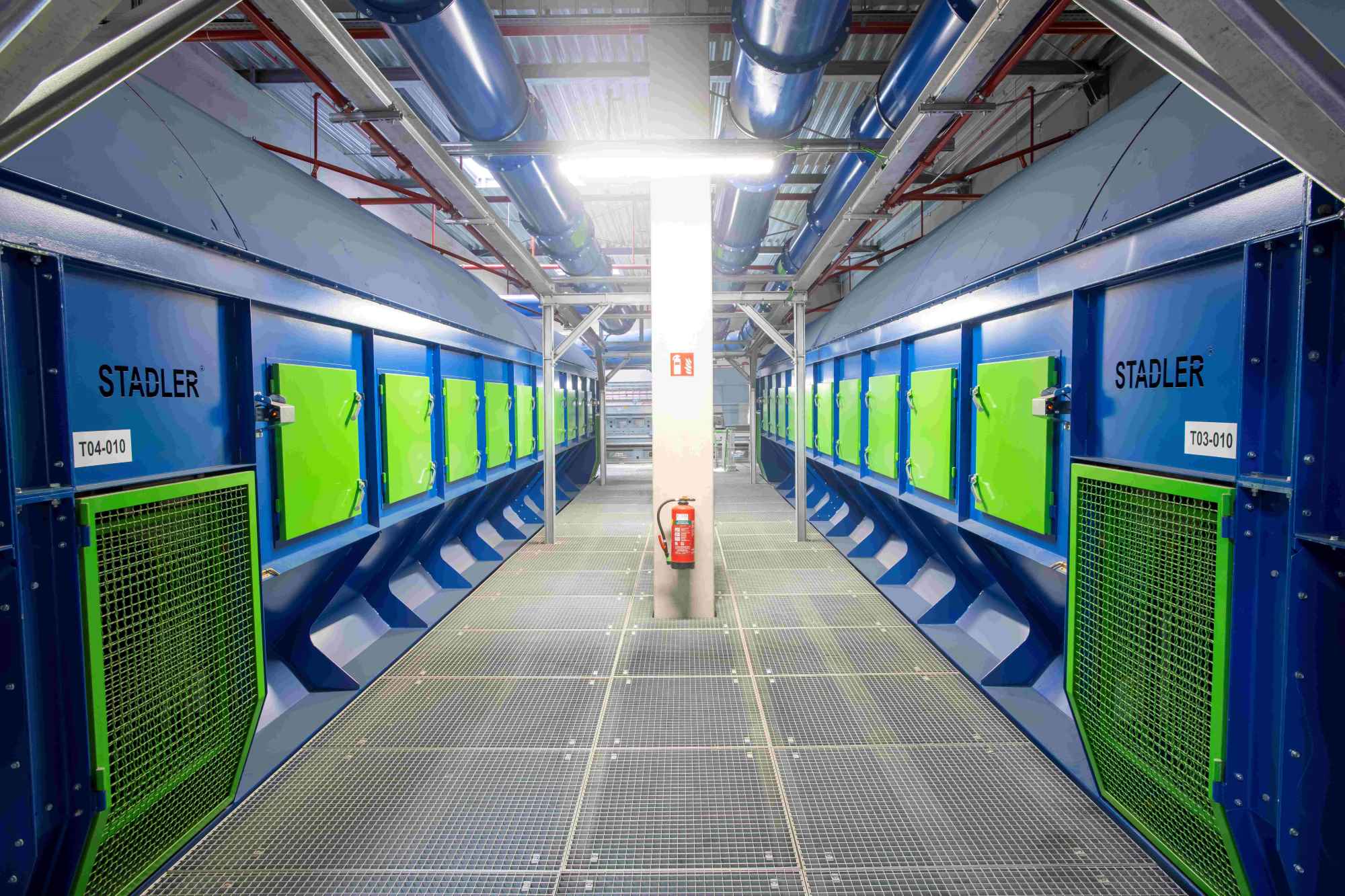 L’impianto si distingue per il livello elevato di automazione intelligente lungo tutto il processo. Quattordici sensori volumetrici sviluppati internamente da Stadler monitorano costantemente il flusso di materiale, consentendo regolazioni in tempo reale e stabilità operativa.