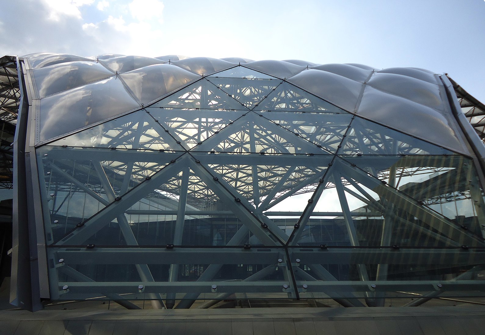 Film sottili in ETFE sono utilizzati come rivestimenti leggeri e trasparenti in strutture architettoniche innovative, come coperture di stadi e serre, grazie alla loro resistenza agli agenti atmosferici e alla radiazione ultravioletta (figura 3).