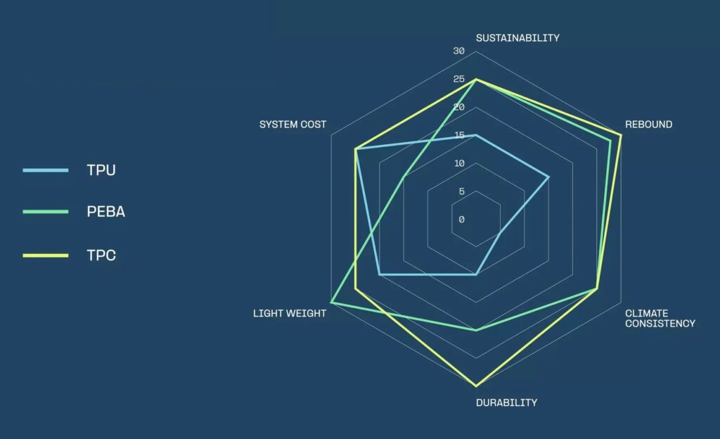 Secondo l’azienda, i materiali usuali in questo tipo d’applicazione non soddisfano appieno tutte le caratteristiche richieste. L’EVA (etilenvinilacetato) è leggero e relativamente economico, ma il ritorno di energia non è dei più efficaci e la fase di reticolazione chimica rende difficile il riciclo.