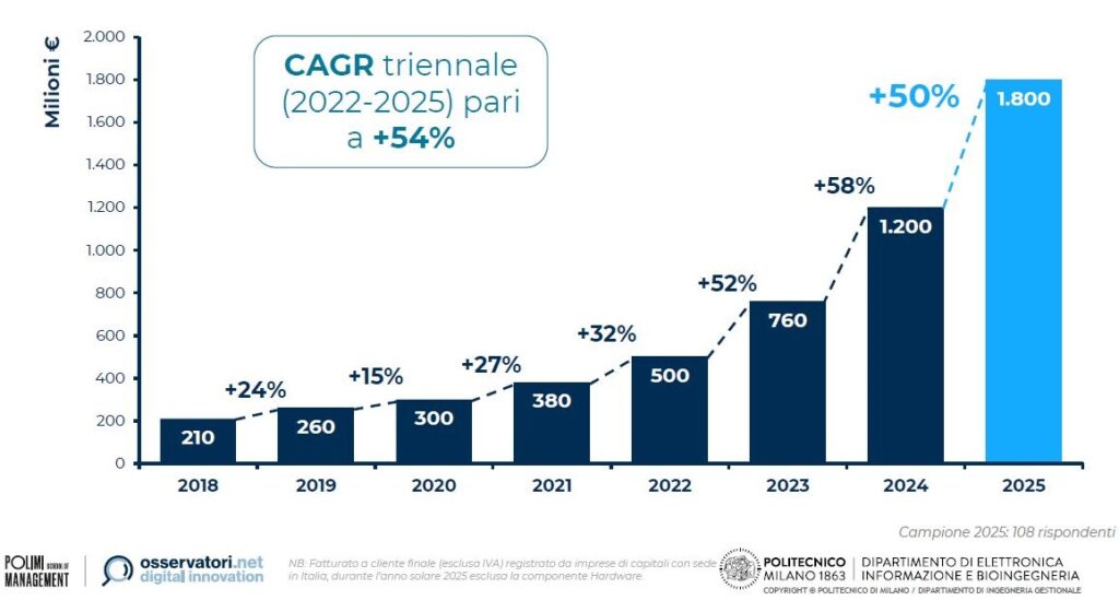 Nel 2025 il mercato italiano dell’intelligenza artificiale ha raggiunto il valore di 1,8 miliardi di euro, in crescita del +50% rispetto al 2024, secondo una ricerca dell’Osservatorio Artificial Intelligence* del Politecnico di Milano, presentata a Milano lo scorso 5 febbraio, durante il convegno “Artificial Intelligence: adozione, trasformazione, equilibrio”.