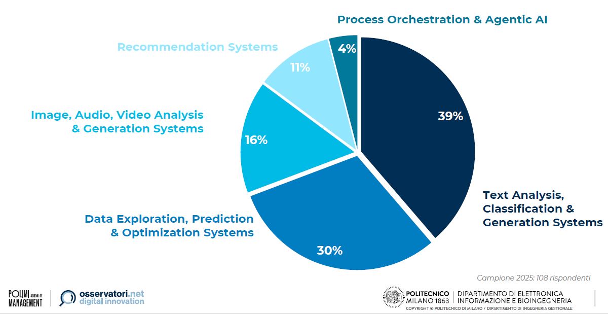 Tra le tipologie di soluzioni, i sistemi conversazionali o di analisi dei testi rappresentano la fetta più importante del mercato (il 39%), spinti in particolare da applicazioni della GenAI sulla knowledge base aziendale, come manuali, normative o documentazione di supporto. Seguono i sistemi di Data Exploration, Prediction & Optimization (30%) e le soluzioni di generazione e analisi di immagini, video e audio (16%, in forte crescita). È stabile la quota di Recommendation Systems (11% del mercato), mentre restano ancora marginali i sistemi di Process Orchestration e Agentic AI (4%), che si dotano però di meccanismi di orchestrazione sempre più intelligenti grazie al ruolo degli LLM (Large Language Models).