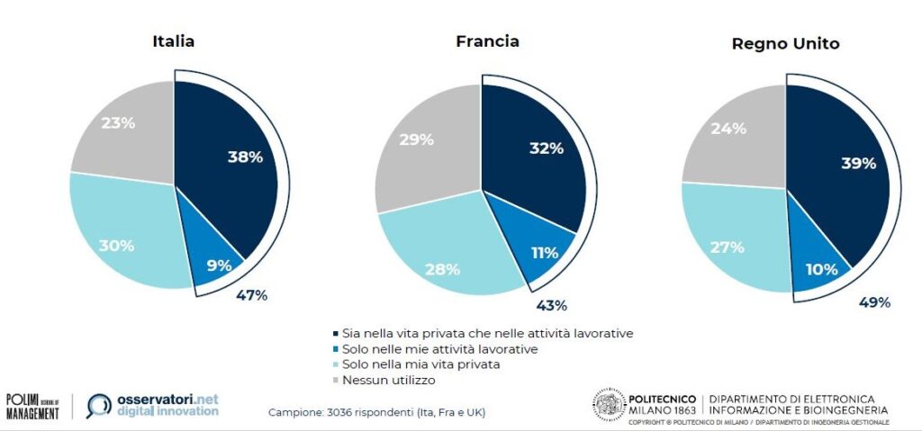 Il 41% dei lavoratori afferma però che grazie all’AI svolge attività che non sarebbe in grado di fare o che potrebbe realizzare solo parzialmente. Solo il 19% degli utilizzatori dichiara di fare uso esclusivo di strumenti aziendali, un dato allarmante che lascia presupporre fenomeni di Shadow AI.