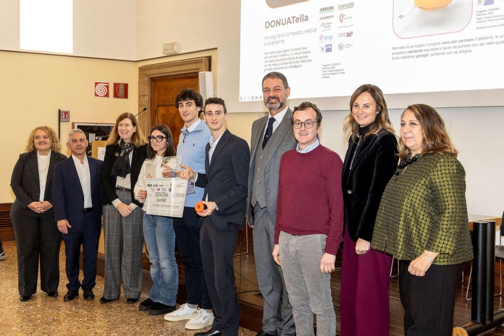 Tra questi, è stato premiato come vincitore assoluto “DONUTella”, di Matteo Bazzacco, Caterina Gasparini e Paolo Levorato: un avvolgicavo a forma di ciambella per la ricarica del telefono, compatto e funzionale, progettato per evitare l’aggrovigliarsi dei cavi e portare ordine e praticità nella vita di tutti i giorni. Quest’ultimo, oltre ad aggiudicarsi il premio in denaro, sarà effettivamente realizzato e utilizzato nelle attività dimostrative delle imprese.