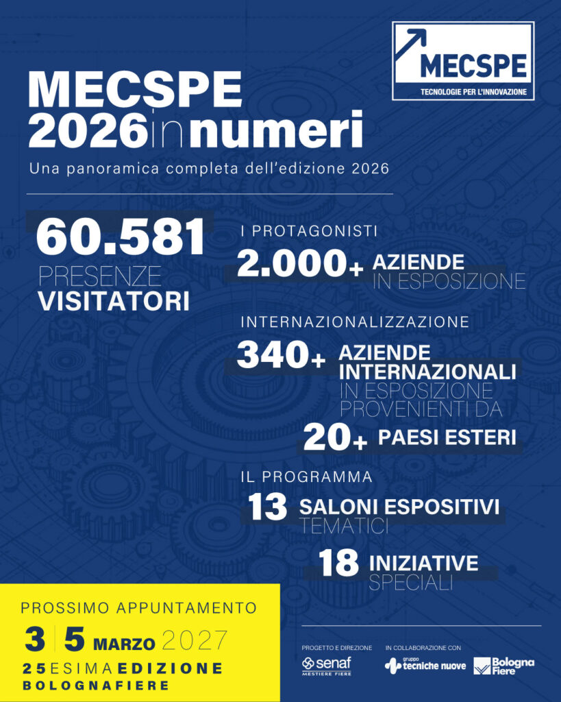 Si è chiusa con 60581 visitatori e più di 2000 aziende la 24a edizione di Mecspe, la fiera internazionale di riferimento per l’industria manifatturiera, organizzata da Senaf e tenutasi a BolognaFiere dal 4 al 6 marzo 2026.