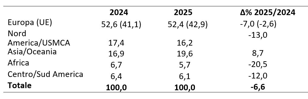Il cedimento di qualche punto dell’export – nell’ordine del -6% per il cumulato gennaio-settembre, rispetto allo stesso periodo del 2024 – determina una flessione stimata sull’intero anno in cinque punti percentuali della produzione che, mediamente, è destinata per tre quarti ai mercati esteri.
