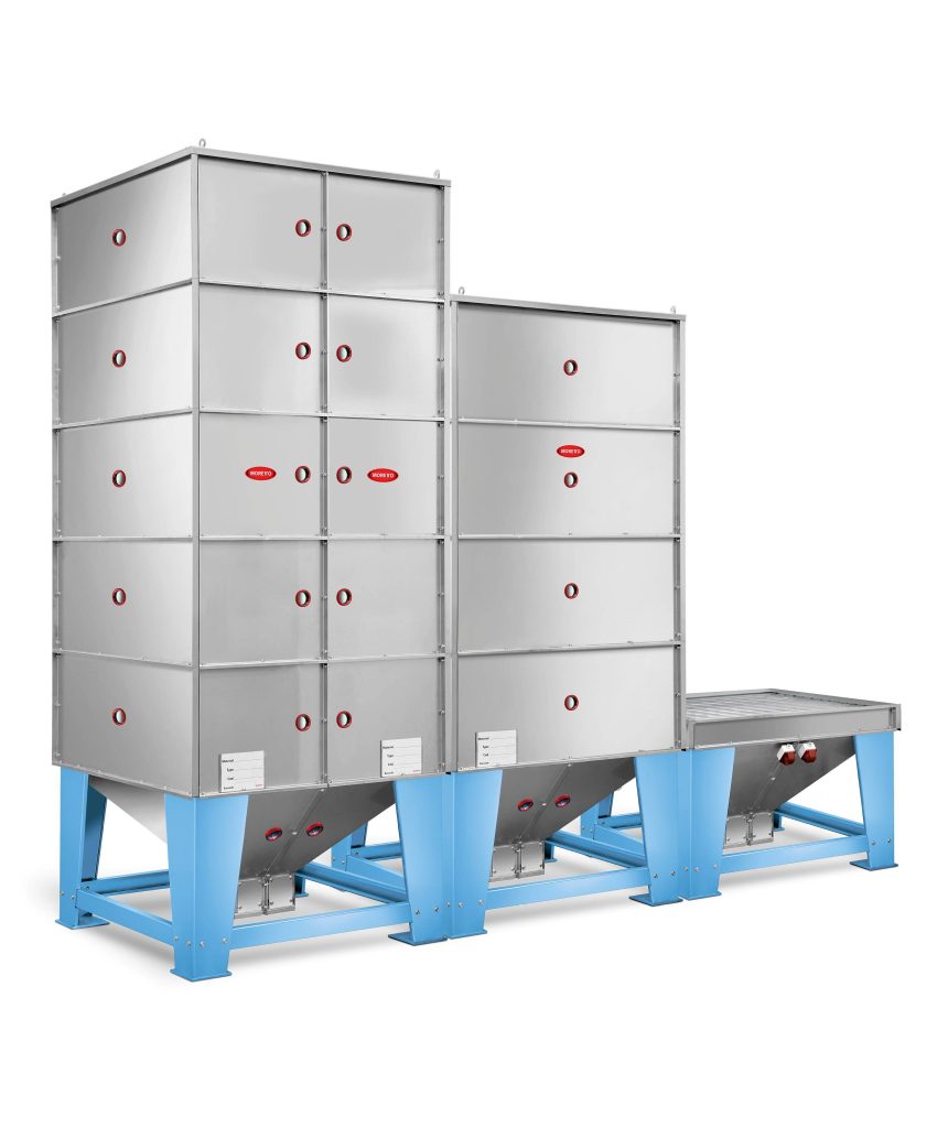I contenitori di stoccaggio componibili di Moretto, da 400 a 50000 dm3, sono costruiti in acciaio inox e sono adatti per l’installazione indoor, compatti e idonei allo stoccaggio di materiali in granulo. La serie dispone di 24 modelli in versione UNI, monocamera, e 24 modelli in versione Twin, a doppia camera.