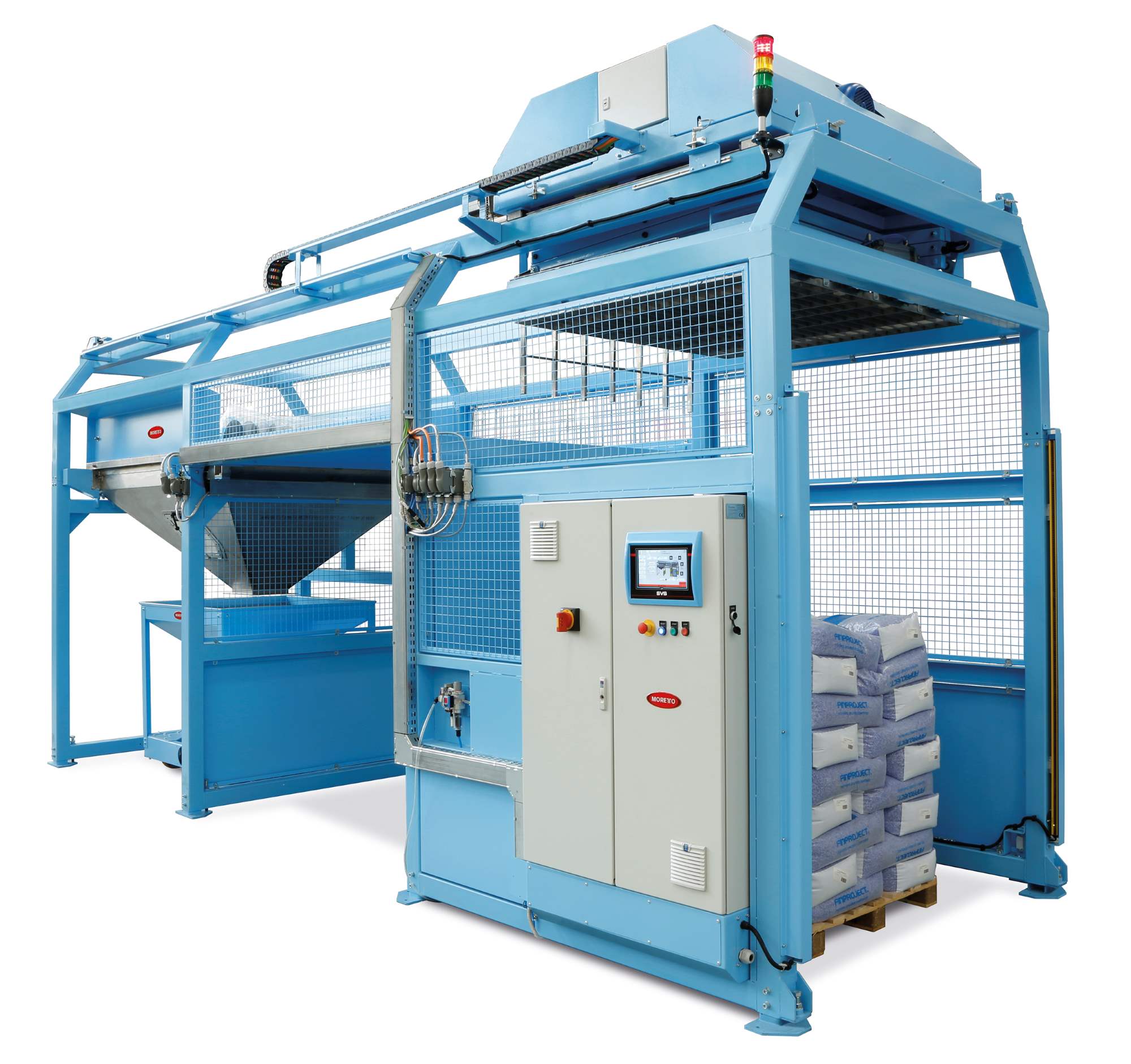 Il ciclo del sistema è completamente automatico, con una capacità di svuotamento fino a 800 sacchi/ora. L’interfaccia utente è un touch screen da 10 pollici per la gestione di tutti i parametri della macchina. Inoltre, è disponibile un sistema di compressione dei sacchi vuoti. I pallet svuotati vengono a loro volta gestiti e impilati in apposita stazione. Opzioni disponibili: